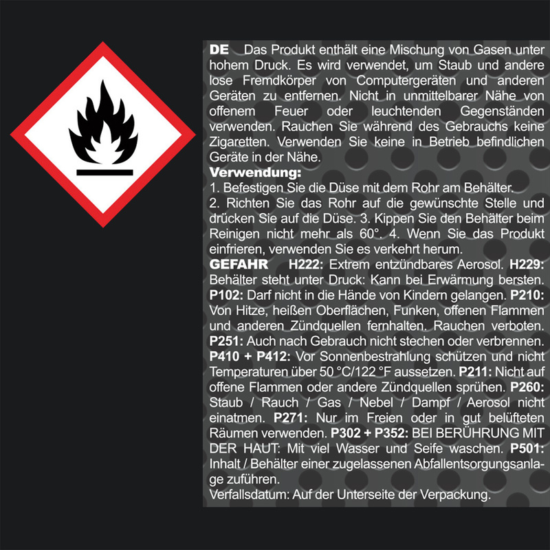 To use AABCOOLING Compressed gas duster safely, it is necessary to read the safety data sheet and/or the product label as well as to observe the safety measures: