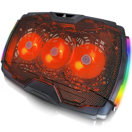 Simple à utiliser et facile à installer. Placez votre ordinateur portable sur la tablette et branchez le câble USB dans la prise USB. Tournez le potentiomètre dans le sens des aiguilles d'une montre pour démarrer les ventilateurs et régler leur vitesse. Un autre avantage est le second port USB du berceau, que vous pouvez utiliser pour connecter des équipements supplémentaires tels qu'une souris ou un lecteur de stylo. En connectant le socle, vous ne perdez aucun port USB sur votre ordinateur portable. Bouton avec l'icône "Soleil", permettant de contrôler le rétroéclairage par LED RVB (une pression de 3 secondes sur le bouton permet d'activer/désactiver l'éclairage latéral RVB).